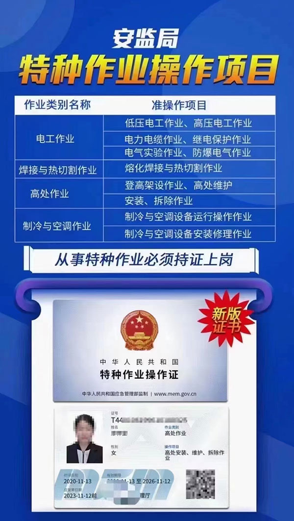 低壓電工操作證,高壓電工操作證,熔化焊接與熱切割作業,焊工操作證,電力電纜,繼電保護,電氣試驗,防爆電氣作業,高處安裝維護拆除作業,登高架設作業,制冷與空凋設備運行操作作業,制冷與空凋設備安裝修理作業,施工吊裝作業,施工挖裝作業,危化品負責人/管理人員,危化品從業人員上崗證。