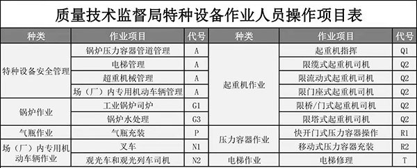 《特種設備作業證》工種:特種安全設備管理A、起重機指揮Q1、起重司機(限門座式起重機)Q2、起重司機(限門式起重機)Q2、起重司機(限纜索式起重機)Q2、起重司機(限塔式起重機)Q2、起重司機(限流動式起重機)Q2、起重司機(限升降機)Q2、叉車司機N1、觀光和觀光列出司機N2、電梯維修T、鍋爐壓力容器壓力管道管理A、電梯管理A、起重機械管理A、場(廠)內專用機動車輛管理A、工業鍋爐司爐G1、鍋爐水處理G3、快開門式壓力容器操作R1、移動式壓力容器充裝R2、氣瓶充裝P。特種設備作業證是由質監局"頒發"的證特種設備作業證,每4年一審。