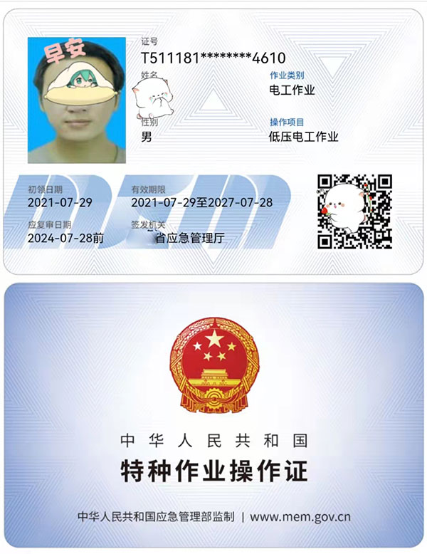 特種作業操作證:作業種類:電工(俗稱 操作證、上崗證)。分類: 高壓操作、低壓操作。
