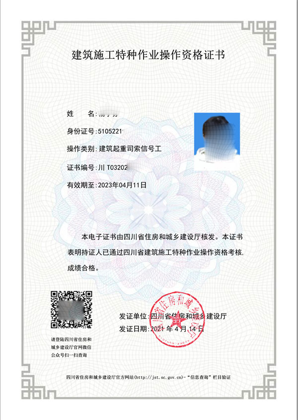 建筑起重司索信號工特種作業操作資格證書建設廳頒發的