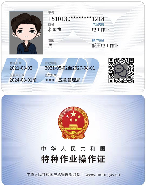 ,低壓電工證”,又稱“ IC 卡”、"上崗證”、”操作證”等。它由“安全生產監督