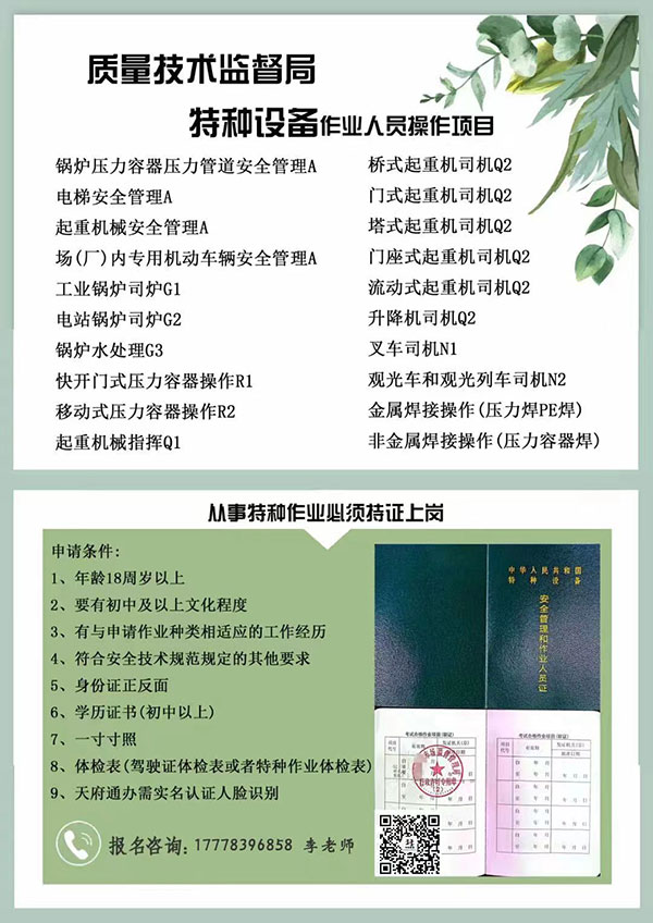 四川省質(zhì)量技術(shù)監(jiān)督局《特種設(shè)備作業(yè)證》報名咨詢電話:李老師:177-7839-6858(微信同號),隨時報名,周周考試,國網(wǎng)查詢,全國通用,新訓(xùn),復(fù)審,同步進(jìn)行!