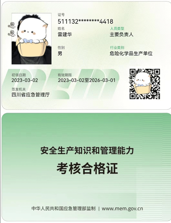 所有安全生產經營單位含(非煤礦山企業、冶金有色生產企業、危險化學品企業、非高危生產經營單位、交通運輸企業、金屬非金屬礦山企業、煤礦企業、石油天然氣作業、職業康負責人和安全生產管理人員)負責人和安全管理人員,經培訓合格后,頒發四川省應急廳統一監制的安全資格證書
