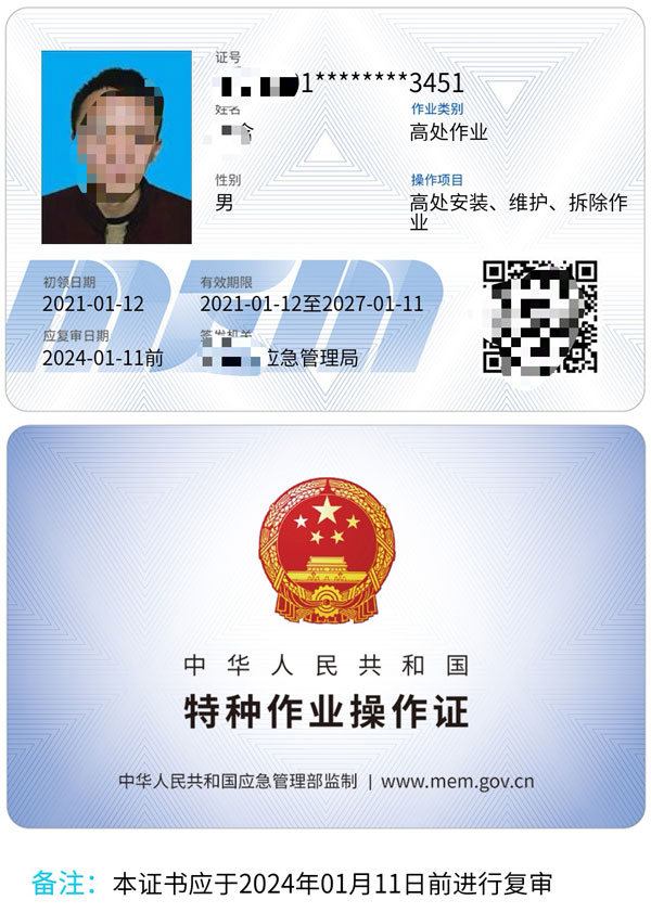 證書適用于利用專用設備進行建筑物內外裝飾、清潔、裝修,電力、電信等線路架設,高處管道架設,小型空調高處安裝、維修,各種設備設施與戶外廣告設施的安裝、檢修、維護以及在高處從事建筑物、設備設施拆除作業。