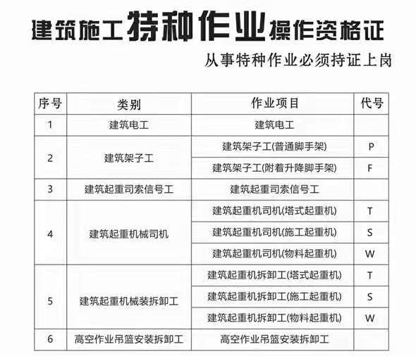 建筑施工特種作業(yè)包括:建筑電工;建筑架子工;建筑起重信號(hào)司索工;建筑起重機(jī)械司機(jī);建筑起重機(jī)械安裝拆卸工;高處作業(yè)吊籃安裝拆卸工;建筑起重司機(jī)塔式起重機(jī) ;